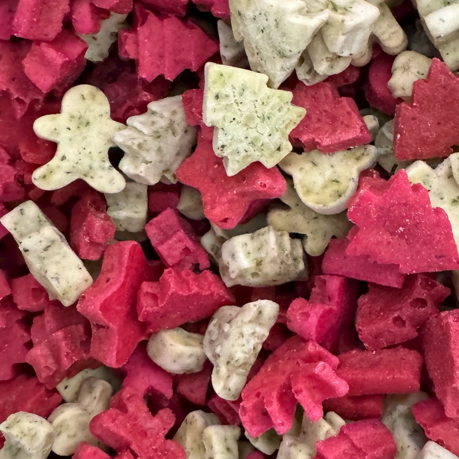 Die Weihnachtsmischung sind Leckerlies in Mini Midi Grösse gemischt zwischen ca. 1,5 cm und ca. 2,3 cm der beliebten Sorten Deep Red und Mint Kiss in süssen Weihnachtsformen