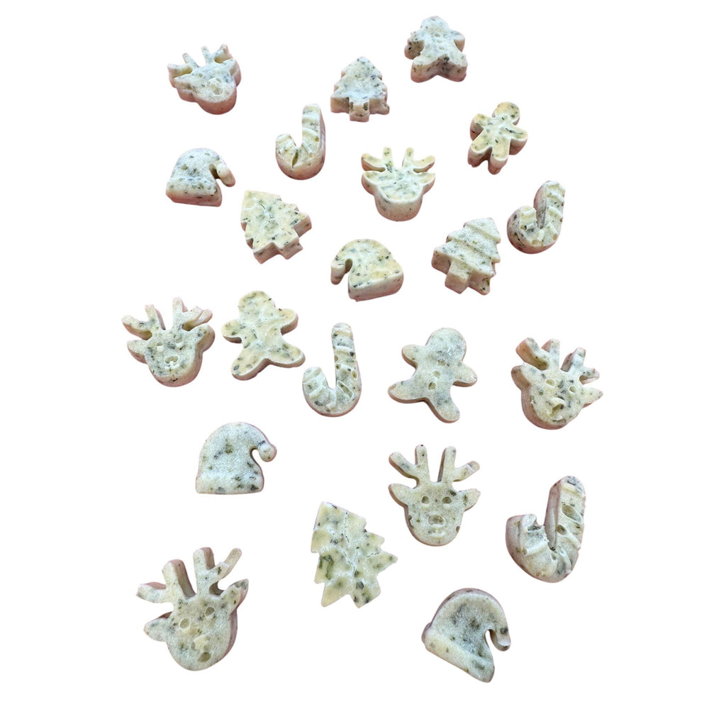 Standardverpackung mit Weihnachtsdesign Die Weihnachtsleckerlies sind Leckerlies in Mini Midi Grösse gemischt zwischen ca. 1,5 cm und ca. 2,3 cm der beliebten Sorten Deep Red und Mint Kiss in süssen Weihnachtsformen